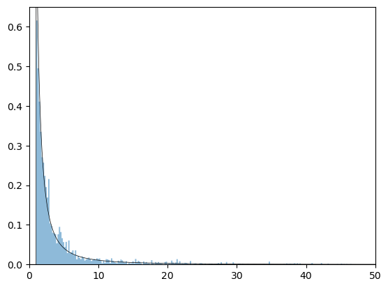 ax.plot(x, dist_pareto_tail.pdf(x), 'k-', lw=0.5, label='pareto pdf')