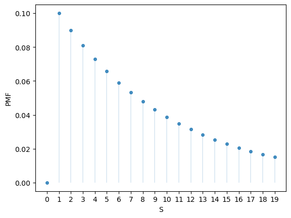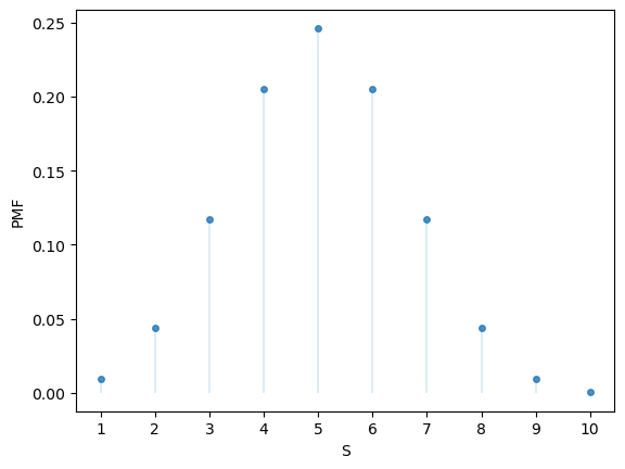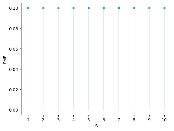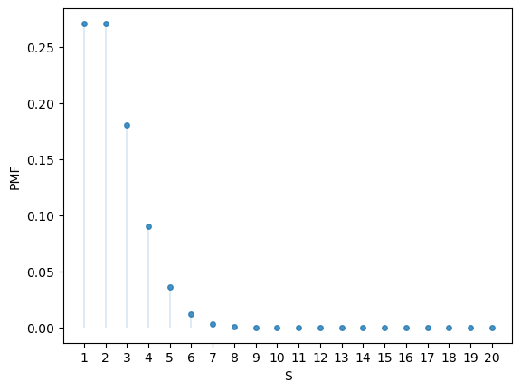 ax.plot(S, u.pmf(S), linestyle='', marker='o', alpha=0.8, ms=4)