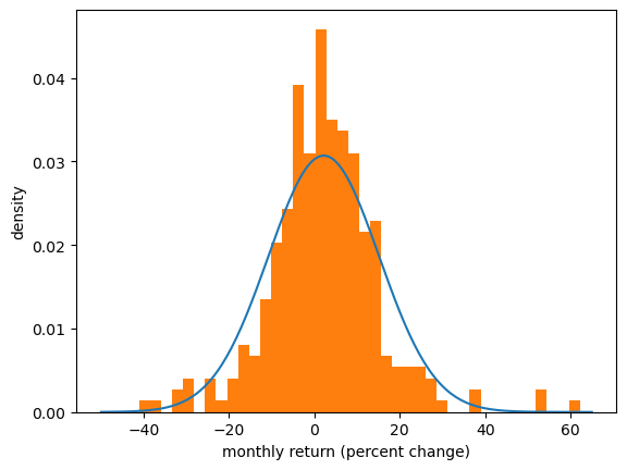 Here we match a normal distribution to the Amazon monthly returns by setting the sample mean to the mean of the normal distribution and the sample variance equal to the variance.