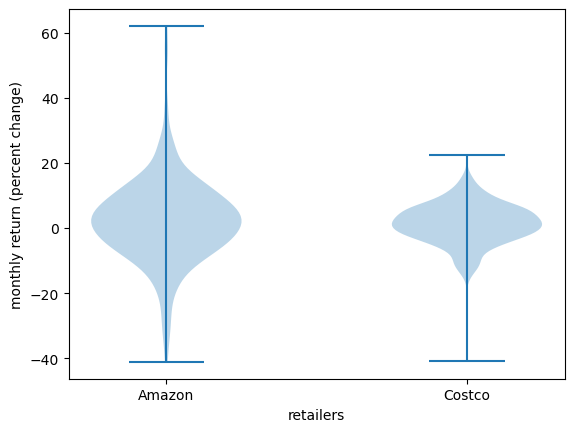 For example, let’s compare the monthly returns on Amazon shares with the monthly return on Costco shares.