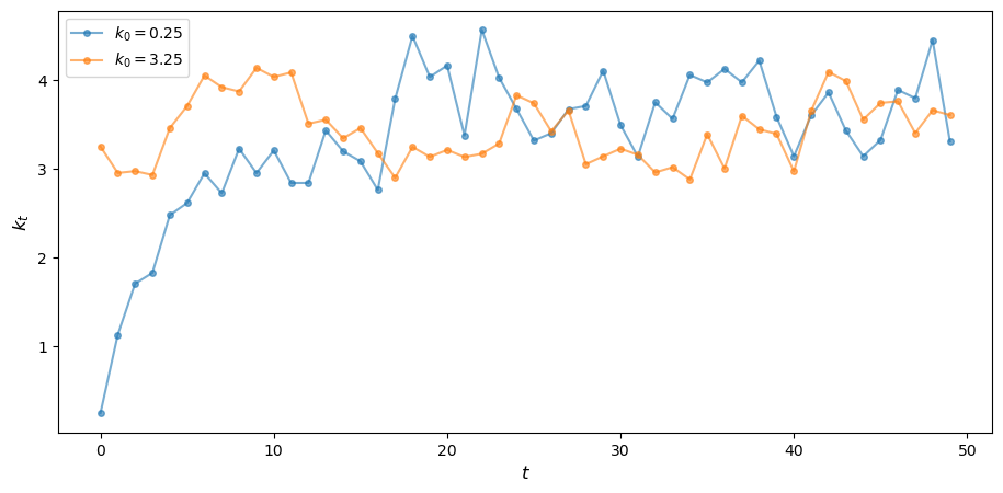 The next figure shows three time paths for capital, from three distinct initial conditions, under the parameterization listed above.