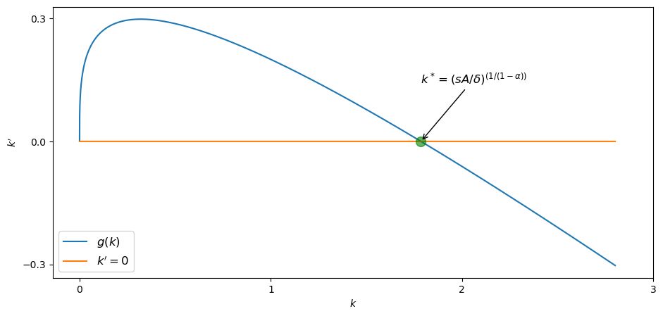 ax.annotate(r'$k^* = (sA / \delta)^{(1/(1-\alpha))}$',