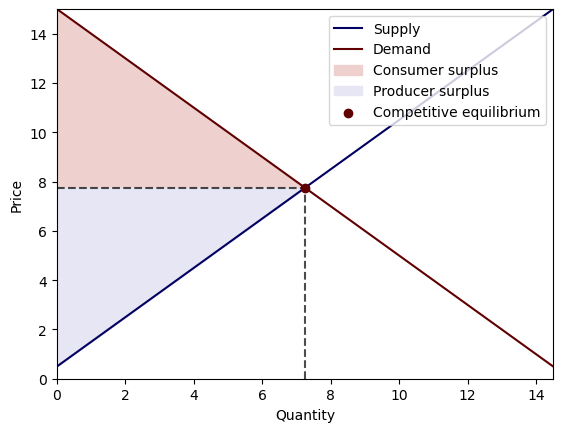Define a function that plots the demand, marginal cost and marginal revenue curves with surpluses and equilibrium labelled.